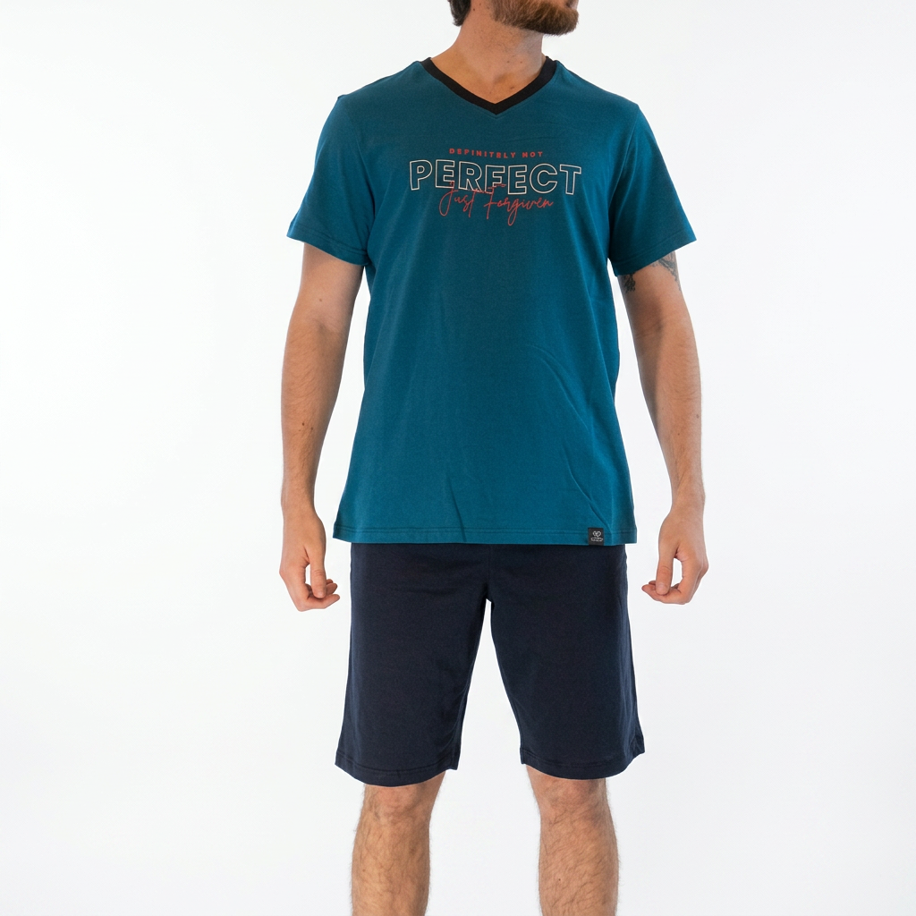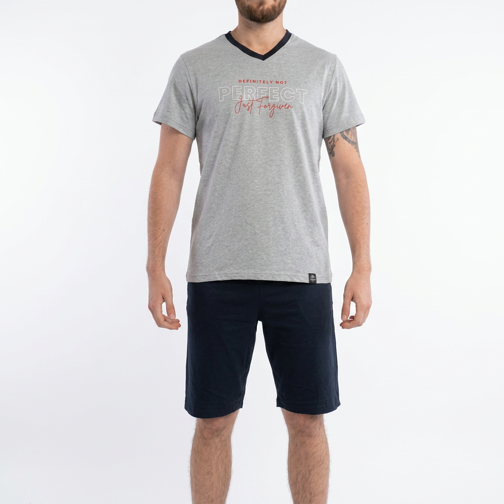 Мъжка лятна пижама изработена от 100% пениран памук с къс ръкав и късо долнище.